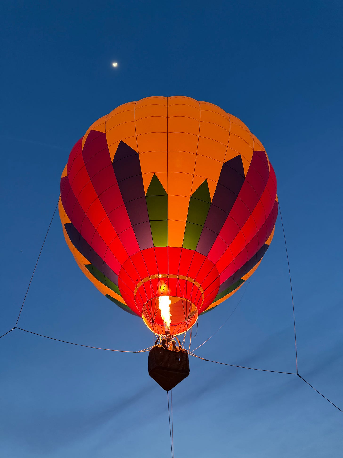 And then, as the evening was winding down, we brought her outside. Waiting in the dark was a hot air balloon, lit up and ready to go, taking her and a handful of guests up into the night sky.