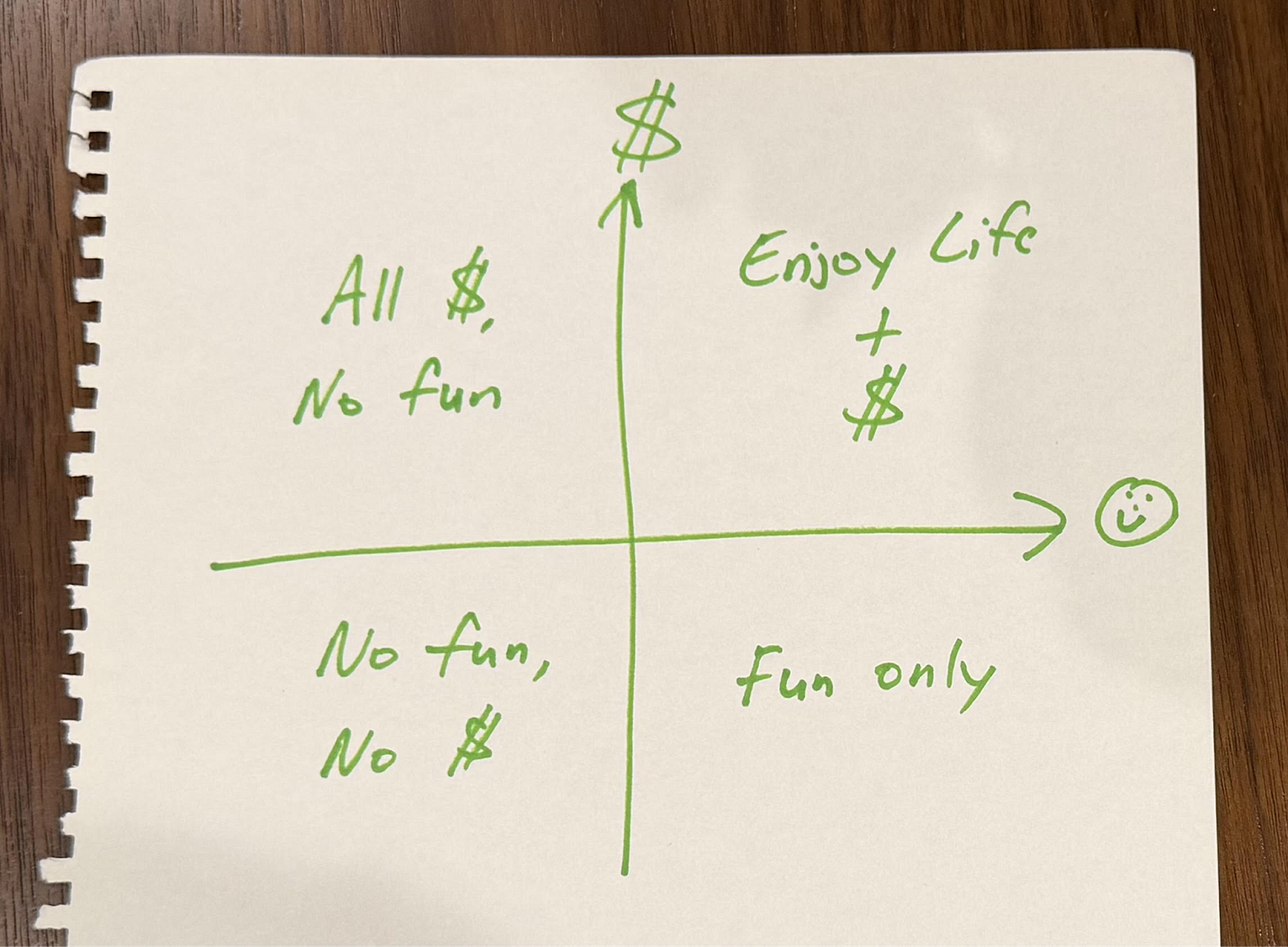 In more recent years, I have been intentional about shifting into the upper right. I still work hard, but the reason is different. I want my life to be rich in money and rich in meaning. I protect family time. I say “no” more often. I think of time as my most precious asset, and money as a tool to protect it. Every day, I am trying to move a little higher and a little more to the right. Toward greater wealth. More joy. A more balanced life.